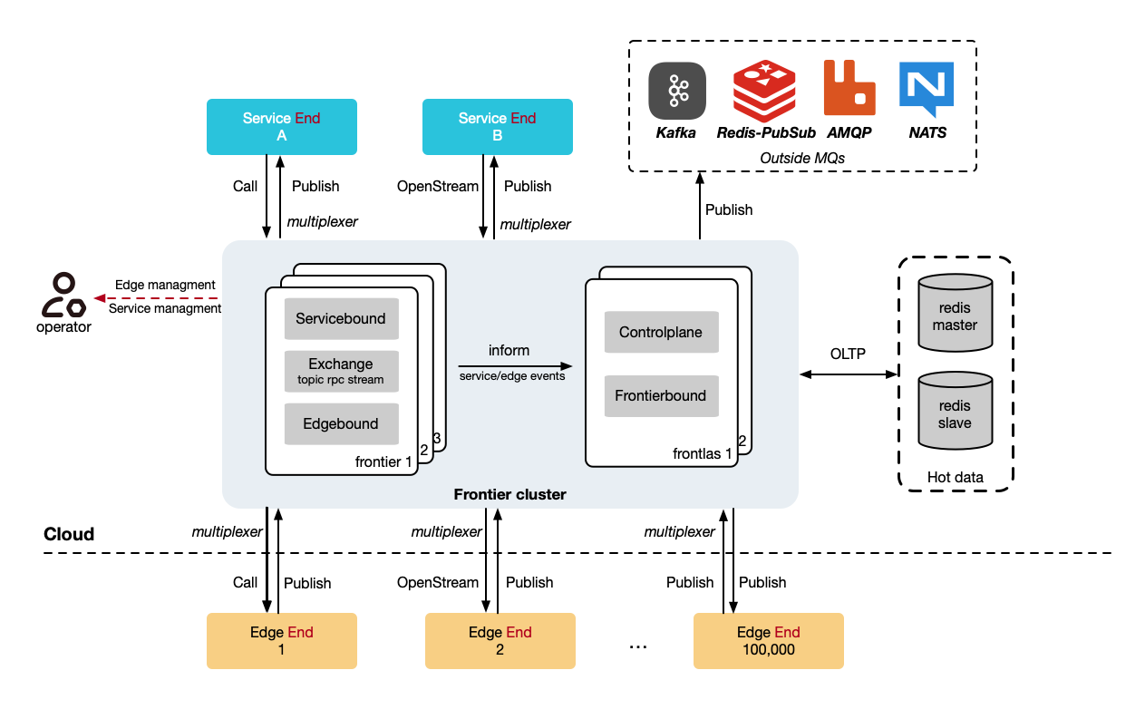 - Microservices query Frontlas to find out which Frontier instance currently holds the connection to the target Edge node, and then establishes communication.